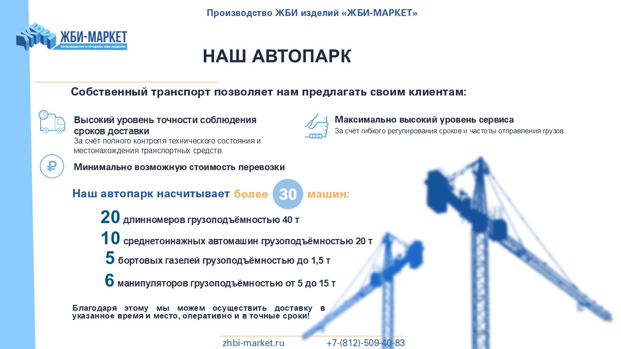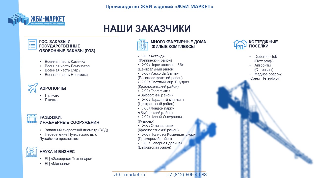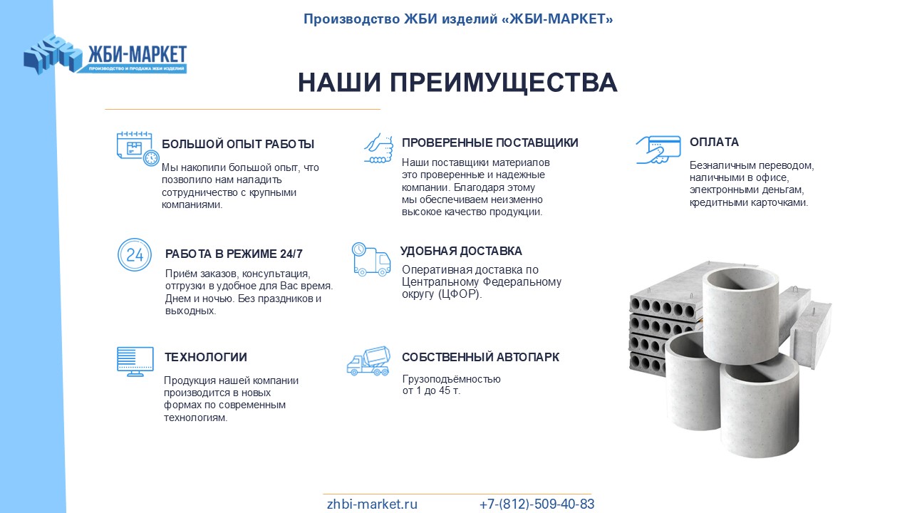 "ЖБИ-Маркет" - это надежный поставщик железобетонных изделий в Никольском и Ленинградской области. Мы успешно работаем с 2010 года и за это время заслужили репутацию надежного и ответственного партнера.